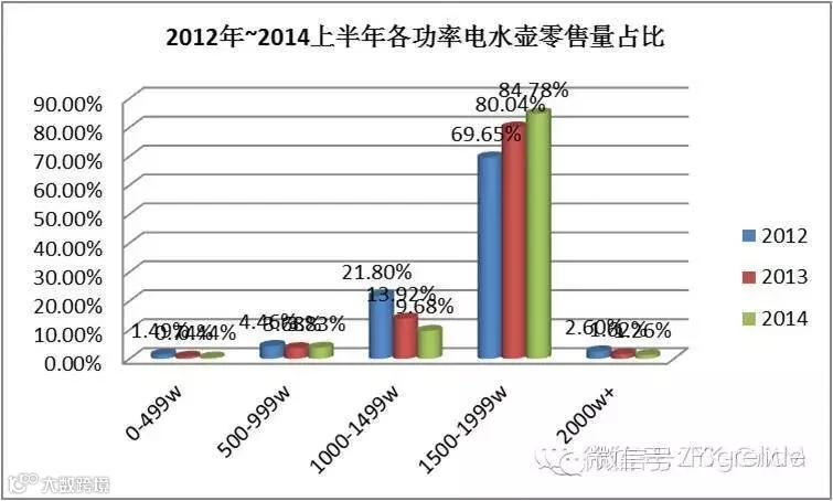 电水壶市场正在向一个大功率的方向在发展,电水壶的功率直接影响着烧水的时间,2012、2013、2014连续三年1500~1999W功率的电水壶呈持续增长的态势,在节省能源的同时更加满足了现代人更快的生活节奏。