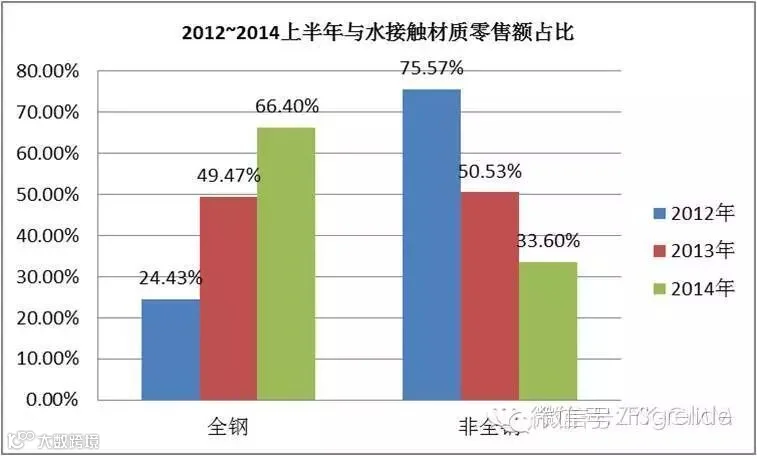 在追求效率与安全的同时大多说人更关心一点“健康”,对于电水壶来说这无疑是代名词之一,每日8杯水这一简单的理念已经深入大部分人们的心中。而人们对电水壶烧水是否健康干净的问题应运而生。现市场大部分电水壶内胆已经全部换为304食品安全级不锈钢,不仅为日常清洗电水壶水垢提供了方便,还为健康饮水增添了一道强有利的保证。也许你认为这个就已经足够了,但是事实证明“我们”还可以做的更好。图3中我们可以看出与水接触材质正在发生着惊人的变化,与水接触全钢以势不可挡的增长速度占据着整体市场的份额。截止到2014年6月与水接触材料为全钢材质的零售额份额已从2012年的24.43%上升到了66.40%。这一小小的细节一定程度上促成了电水壶向着更为健康的方向发展。(注:与水接触全钢定义为内胆与壶盖内壁与水接触皆为不锈钢。)