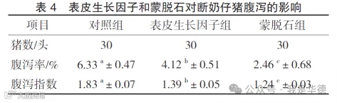 由表4可知,表皮生长因子组和蒙脱石组的腹泻率与腹泻指数显著低于对照组(P <0.05)。与表皮生长因子组相比,蒙脱石组的腹泻率和腹泻指数显著降低(P <0.05)。