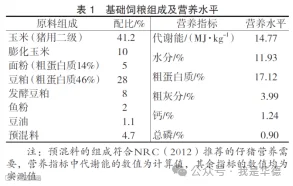 实验共设3组,每组6个重复。对照组饲喂基础饲粮,表皮生长因子(EGF)组饲喂在基础饲粮中添加1mg/kg表皮生长因子的饲粮,蒙脱石组饲喂在基础饲粮中添加1000 mg/kg蒙脱石散和1 mg/kg表皮生长因子的饲粮。主要营养指标见表1。