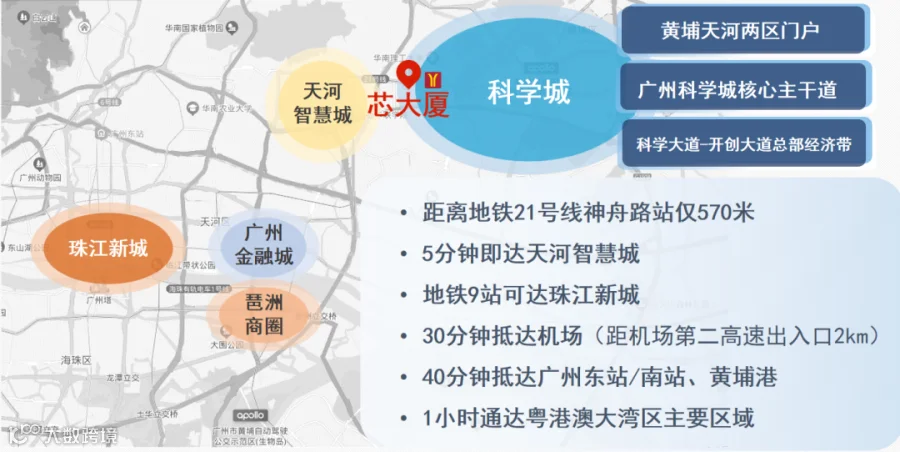 芯大厦坐落于广州核心商务圈,地铁、公交路网四通八达,轻松打造“地铁 + 公交 + 步行”多元绿色通勤方式。