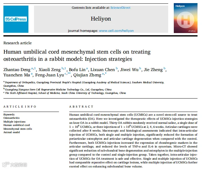 1. Human umbilical cord mesenchymal stem cells on treatingosteoarthritis in a rabbit model: Injection strategies