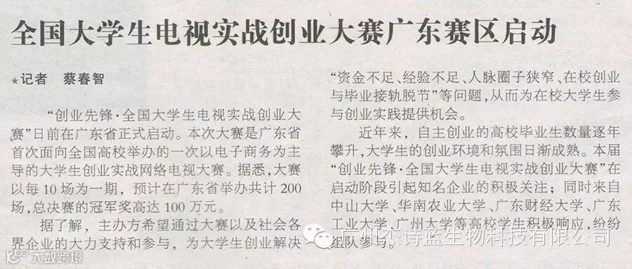 “创业先锋•全国大学生电视实战创业大赛”自启动以来持续火爆,受到各大媒体争相报道。本次创业大赛以大学生创业者为主体,由广州杰诗蓝生物科技有限公司全程赞助,是广东省首次面向全国高校举办的一次以电子商务为主导的大学生创业实战网络电视大赛。