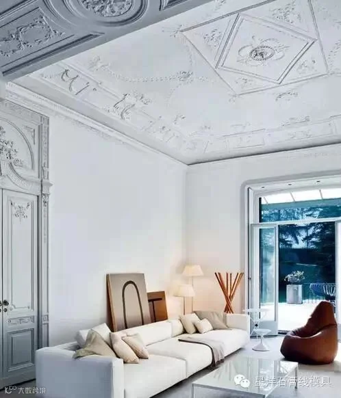 • 平线,花线,圆盘类,可以单独使用。比如八九十年代中国很多会在房间中间安装石膏圆盘,纯装饰,也会直接在此处安装灯具。大家可能经常见到层高很高,复杂线条的顶角线,木门或墙裙,天花中央还会有圆盘,但家具却很简洁或现代,这类多多是欧洲老建筑,老外不想大搞,就只做了布置家具;