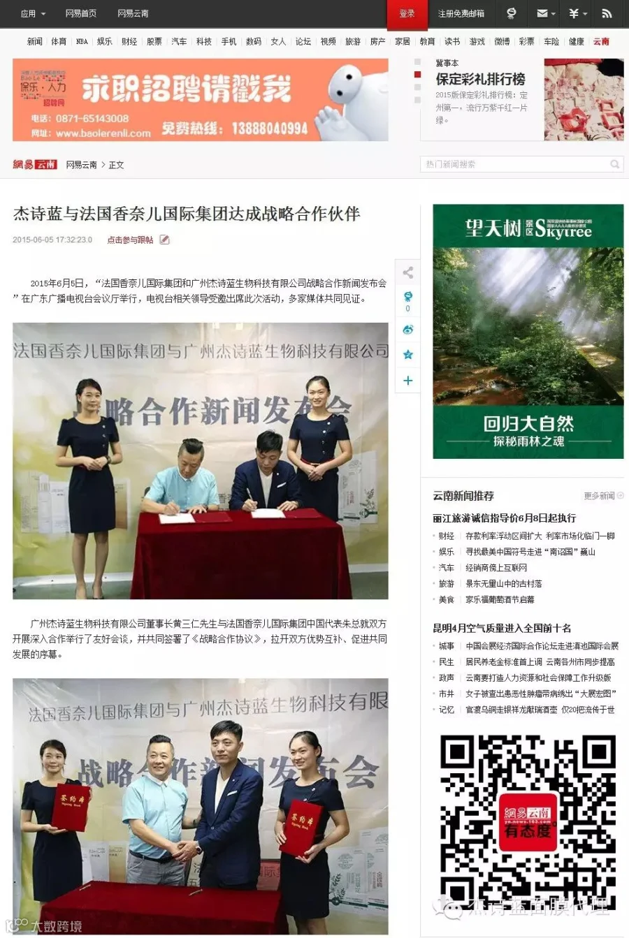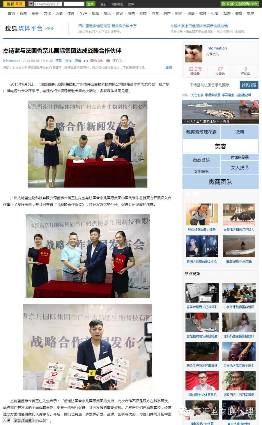 2015年6月5日,“法国香奈儿国际集团和广州杰诗蓝生物科技有限公司战略合作新闻发布会”在广东广播电视台会议厅举行,电视台相关领导受邀出席此次活动。