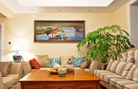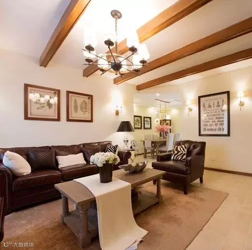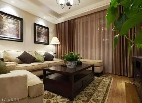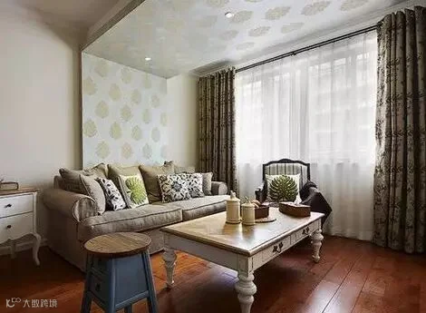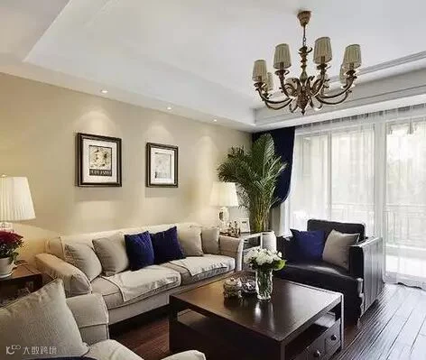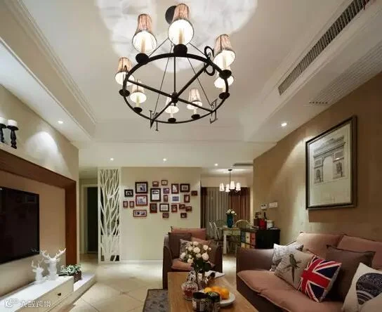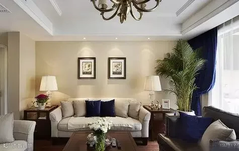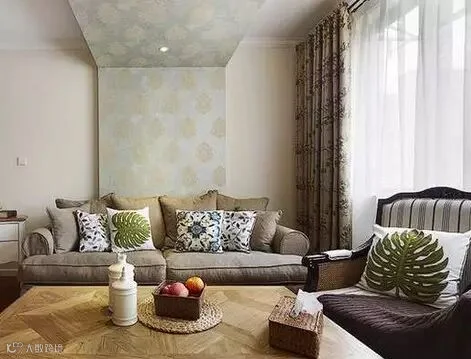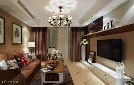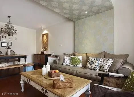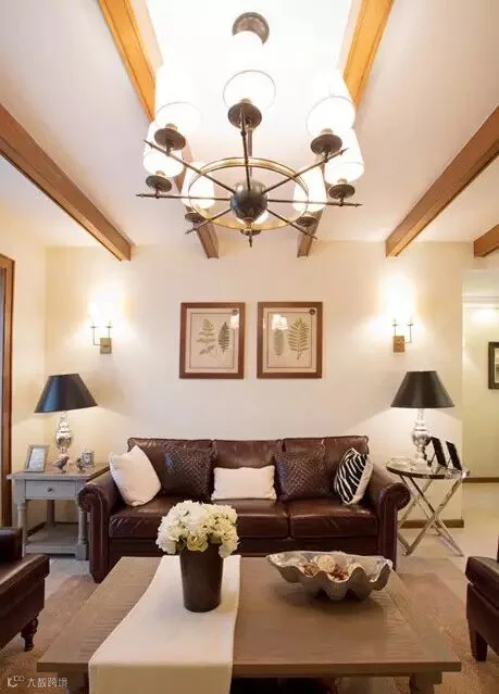 在方正的客厅里,多用简约的布艺、同色系民族印花以及造型灯饰,为美式小家增加低调的浪漫,营造出轻美式的风格。