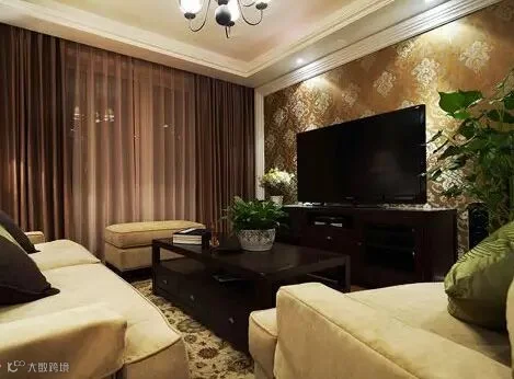 用金色压花墙纸装饰的电视背景墙,搭配地柜式的深棕色电视柜,简单造型中显露出高贵感。