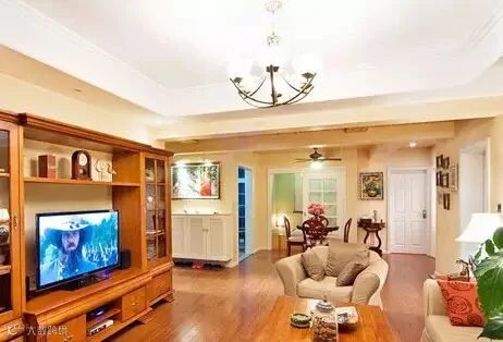 电视背景墙做了收纳柜,美式乡村风格必须的!观赏收纳各不耽误。这个角度就可以看到玄关鞋柜处、餐厅和房门的位置,整体颜色很温暖。