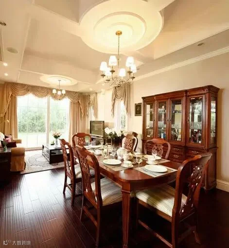 客厅和用餐区处于同一水平线上,怀旧风格的餐桌以及展示柜充满了美式的味道。正宗的美式风格色彩,无论是地板还是餐桌椅都带有了浓浓的怀旧风。吊顶中央也设计了一个圆形的中心,挂上吊灯就是很好的用餐区。