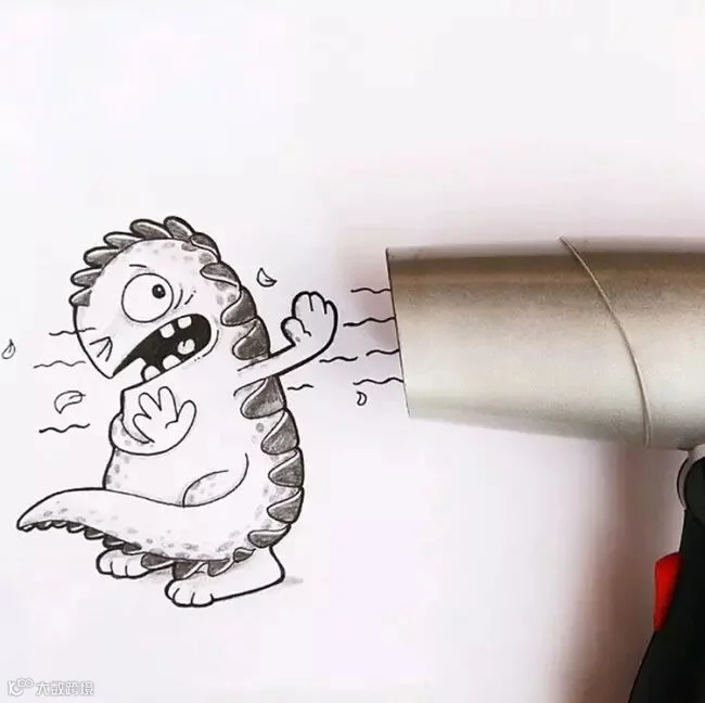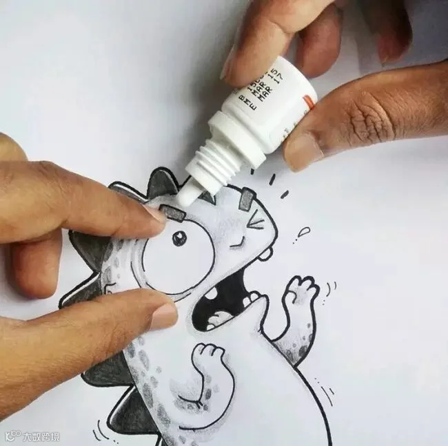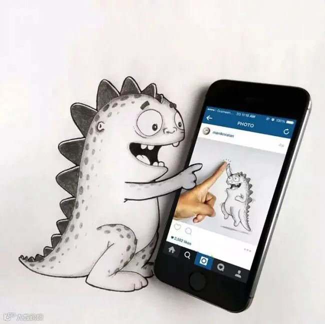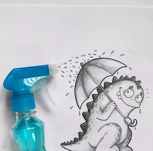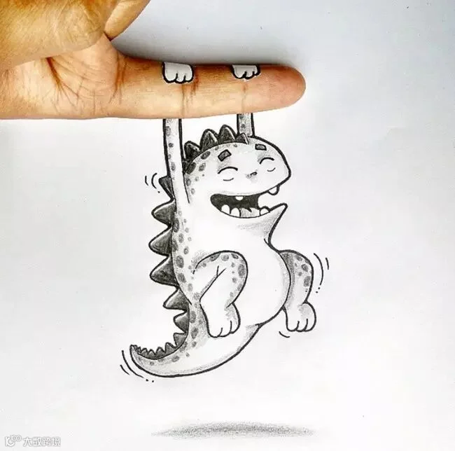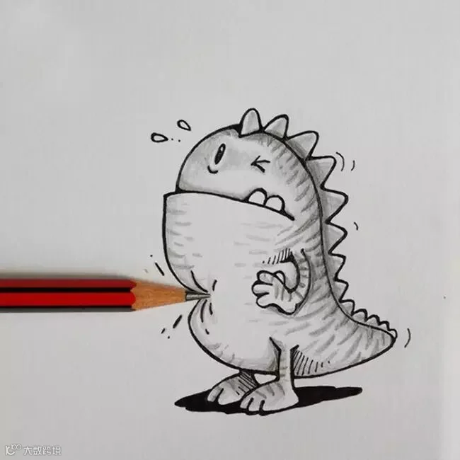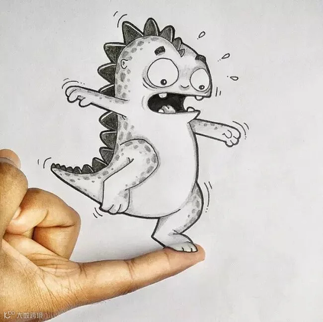 上分享他们的日常涂鸦作品,有天晒出了一张小恐龙的卡通,越看越有意思,从此这条恐龙便成了他们的宠物。最初,他们用铅笔戳它,后来一发不可收拾,把小恐龙放置在各种日常生活场景之中,和日用品互动起来的小恐龙,会做出丰富有趣的