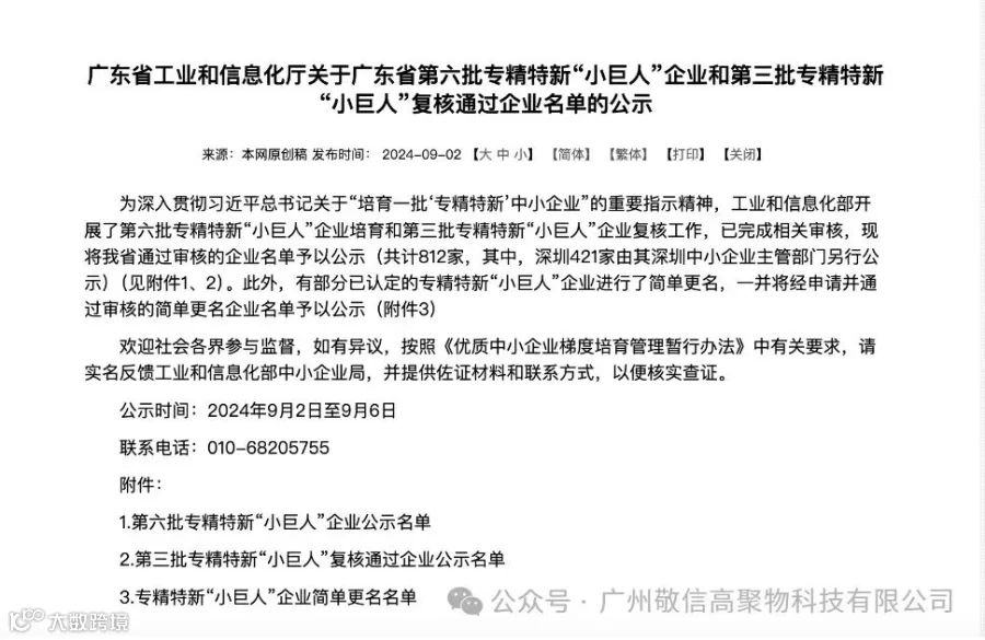 2024年9月3日,广东省工业和信息化厅正式公示了备受瞩目的第六批国家级专精特新“小巨人”企业名单,广州敬信高聚物科技有限公司凭借卓越的科技创新能力和显著的高质量发展成果,光荣入选。