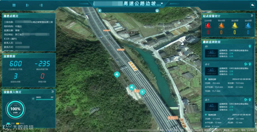 基于北斗高精度定位技术,通过使用北斗接收机、新型多点形变监测仪、多维监测仪、裂缝计、雨量计和AI视频球机等多种监测设备,对边坡表面和内部、支护结构和周边环境等进行全方位监测,实现24小时自动化监测预警,助力公路边坡智慧管养。