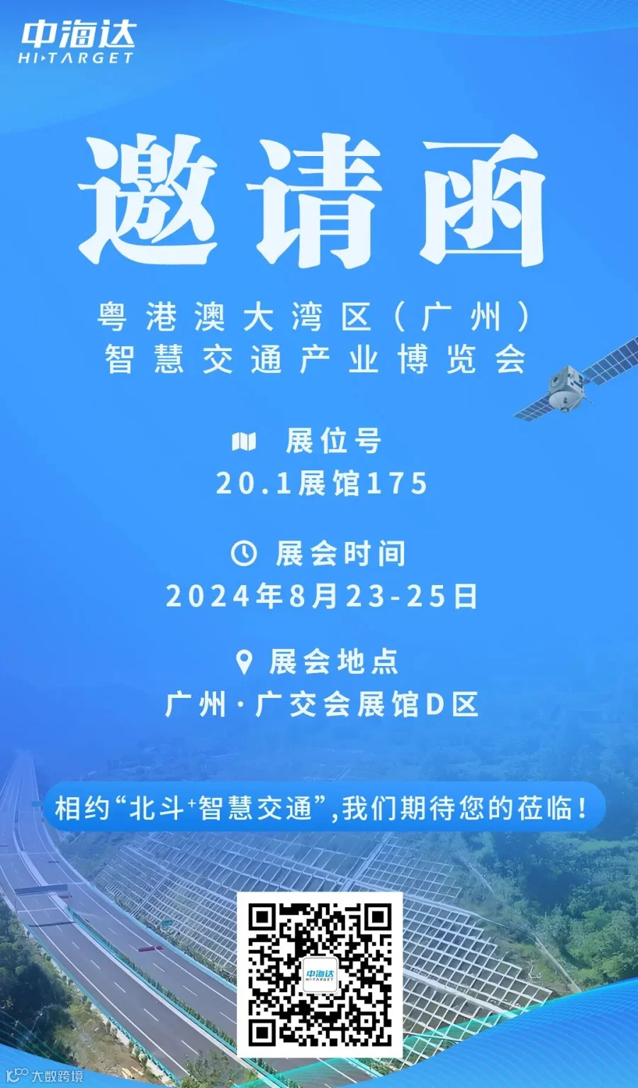 8月23日-25日,中海达将携多款“北斗+智慧交通”相关产品及解决方案亮相2024粤港澳大湾区(广州)智慧交通产业博览会,恭候您莅临广州·广交会展馆D区20.1馆175展位,共话智慧交通!