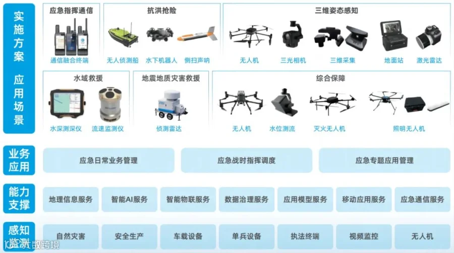 水陆空天一体化:通过北斗终端、侦测雷达、救援无人机、无人船、机器人等应急装备,实现水陆空天一体化应急感知与救援。