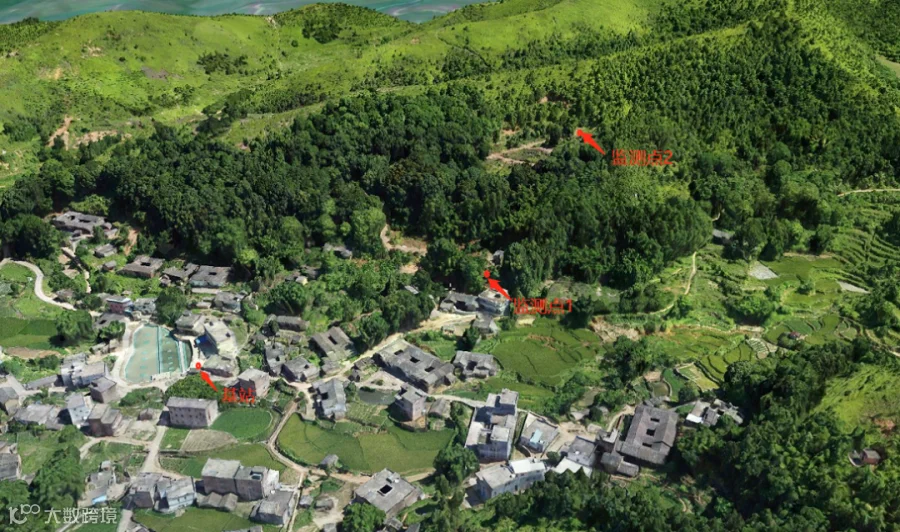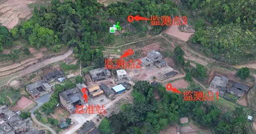 怀集县桥头镇新平村滑坡点处植被茂盛,雨量充沛,土壤水分充足。共建设了1个基准站,3个北斗位移监测点位,选用的点位和监测点分布图及现场部分建设情况图片如下: