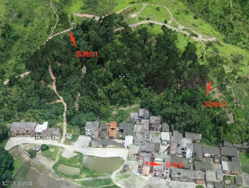 阳山县太平镇太平村滑坡在地貌上属丘陵斜坡地带,位于下坝自然村东北面山体斜坡上。山坡上部植被发育,以草类植物为主,杂树茂盛,局部土体裸露。滑坡区域存在人为山地开发,钩机开挖,削坡建房,山坡人工建筑水池等影响滑坡稳定性的人类工程活动。选用的点位和监测点分布图如下: