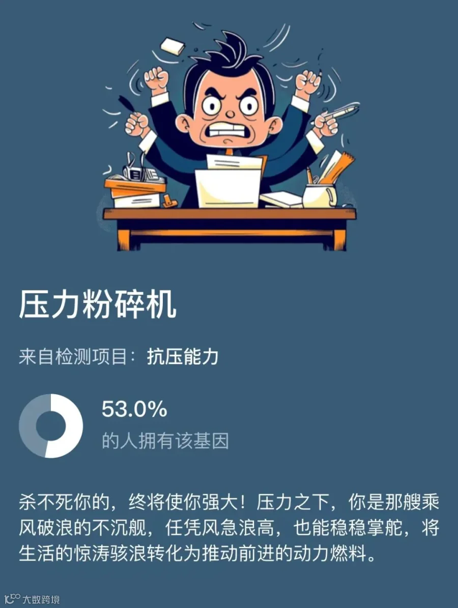 不要让自己的情绪被压力裹挟,抗压能力是可以通过后天努力提升的。了解自己的压力源,寻找合适的宣泄渠道,尝试通过正念呼吸和情绪管理技巧,有意识地给自己松松绑。 也可以体验一下基因宝产品,从皮肤管理、饮食营养、运动到心理健康,还有遗传特质和疾病风险等检测项目,从基因的视角重新了解自己,才能更好地爱自己。 199元即可全面了解自己的健康风险 戳下方购买「基因宝旗舰版套餐」 🔽🔽