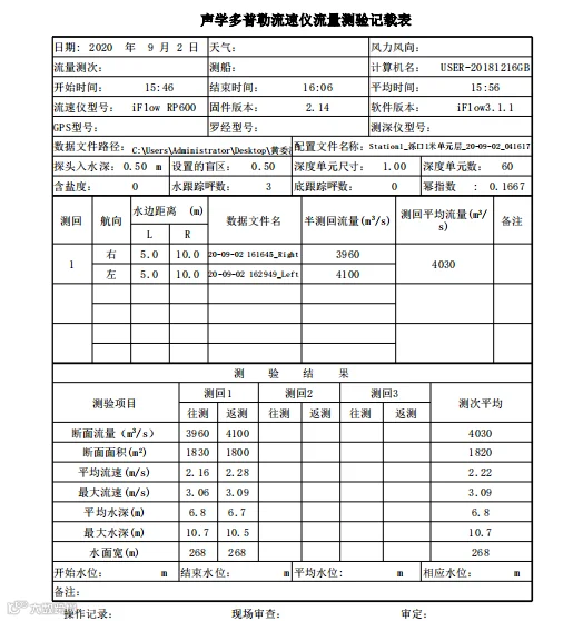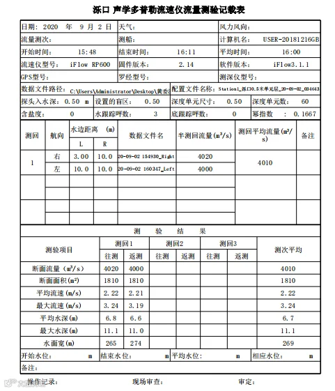 当日泺口水文站在9月2日17点水情发布流量为3980m3/s,与中海达iFlow RP600型ADCP在2日16点左右测量得到的4020m3/s的流量数据,流量相对误差为1.01%,由此可以验证本次iFlow ADCP流量测验亦达到了较高的准确度。
