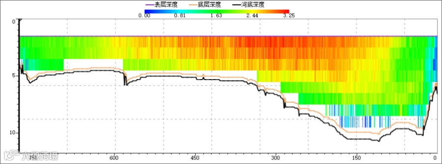 在海洋公司自主研发的iFlow RP600型ADCP配套的iFlow测流量软件中,可以得到泺口段测验断面的整体流速剖面图等各种信息,如下图所示: