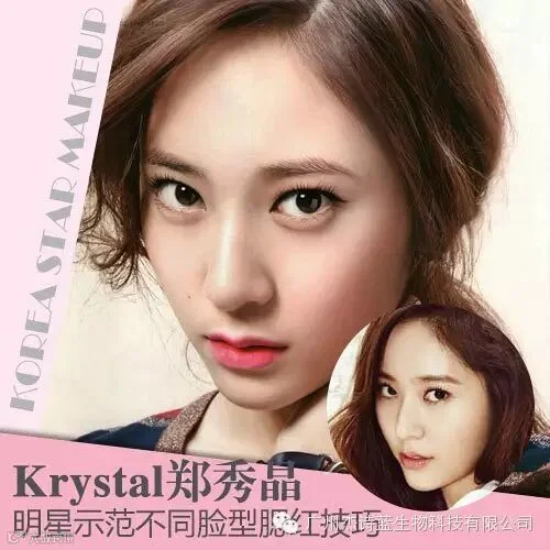妹妹秀晶脸型看上去更为瘦削,同样是淡粉色系的腮红,没有完全打在苹果肌上,而是打在苹果肌稍下的位置。