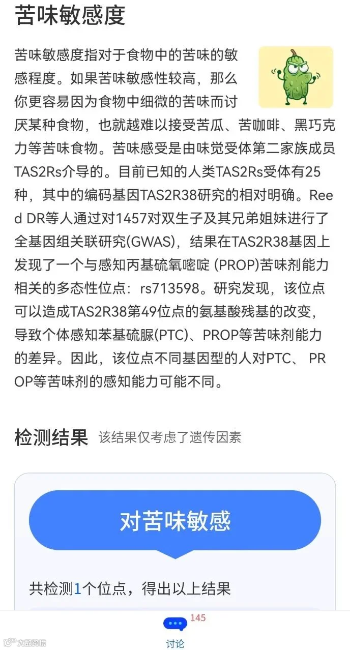 例如,我们每个人对苦味的敏感程度是不同的。以苦味物质苯硫脲(PTC)来说,只有65%的人才能尝出,这与一个叫TAS2R38的基因有关。