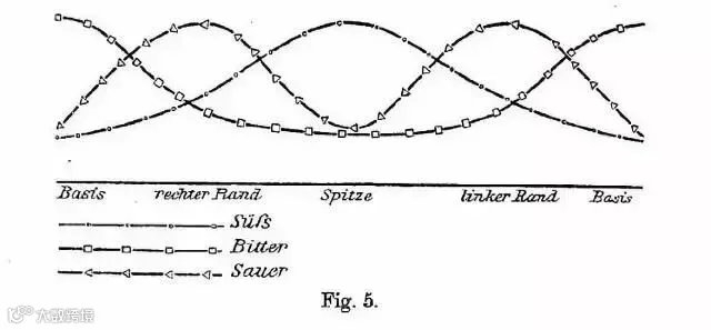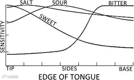 其实,汉尼格给出的图表,只是每种味道从一个点到另一个点的相对敏感度,并没有与其他味觉做对比。