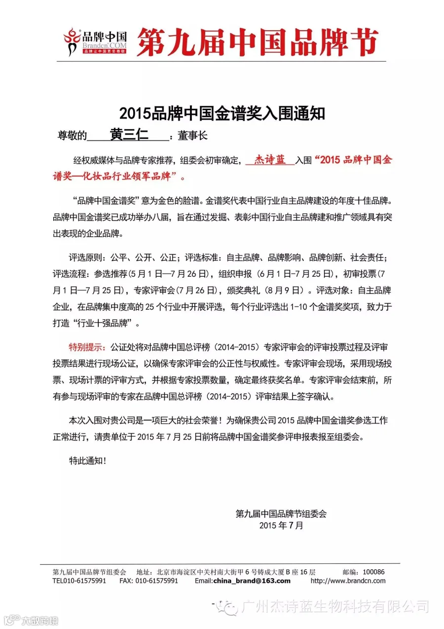 杰诗蓝 入围“2015品牌中国金谱奖—化妆品行业领军品牌”。第九届中国品牌节组委会邀请杰诗蓝董事长黄三仁先生出席颁奖典礼!