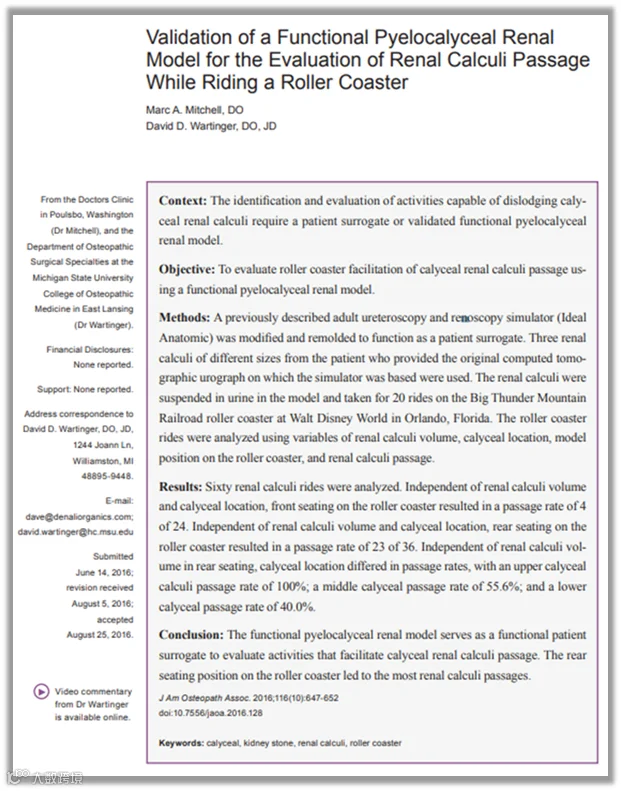 这项有关“结石与尿”过山车之旅的实验“大获成功”,其“研究成果”还郑重其事地发表在了《美国骨病协会的期刊》(The Journal of the American Osteopathic Association)上。