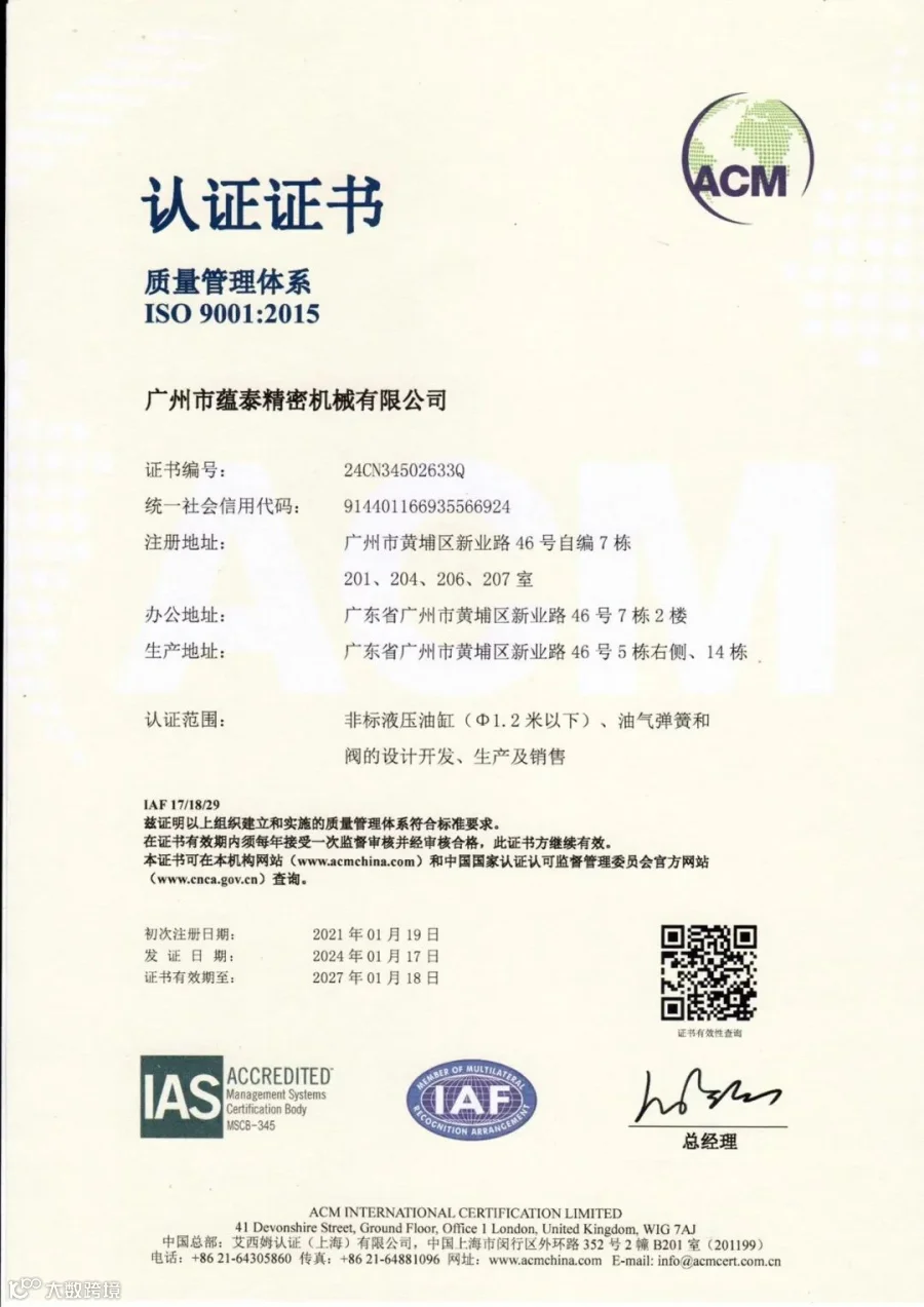 广州市蕴泰精密机械有限公司成立于2009年,是一家专注于液压系统、元件研究、开发、生产及销售的高新技术企业。公司建立有广东省油气弹簧工程技术研究中心、广州市企业研究开发机构,连续多年获得广东省瞪羚企业荣誉称号,是广东省专精特新企业。