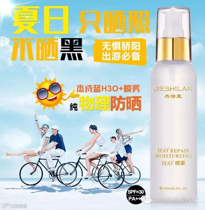 很多人以为每天用防晒产品,肤色没变黑就没问题。研究指出大部份防晒成分都会被阳光分解,曝晒一个小时就抵销8个星期的美白效果,难怪美白一直毫无进展。现在,有杰诗蓝H3O+防晒喷雾帮您解决这一问题:
