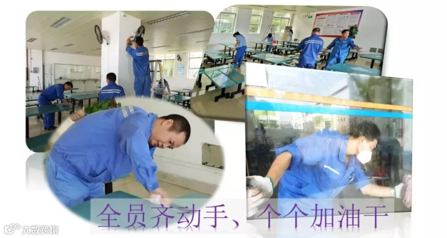 有些人,顶着炎炎烈日和漫天尘土,将空地上的工业垃圾一方方聚集到一起并运走;有些人,毫不介意的在卫生区域使劲儿的擦洗着污渍斑驳的水池边缘、水管和饮水机;有些人,细心的将墙壁上的风扇取下清洗;有些人,突发奇想的找来磨砂纸,将锈迹斑斑的门把手磨得光亮一新;有些人,忍着腰酸腿疼过敏等各种小毛病,将餐厅的玻璃、桌子、椅子、空调的边边角角用刷子刷出新亮度;有些人,忍着陈年潲水的味道刷着平时倒剩饭垃圾桶旁边的柱子;有些人,干脆脱掉鞋袜或忍着湿鞋的痛苦,拿着水管将地板冲刷的光亮如镜;有些人……任凭污渍溅脏衣服,汗水湿透衣背。有些人,是领导者、是管理层、是员工,但在今天,他们都是“管业最美清洁人”