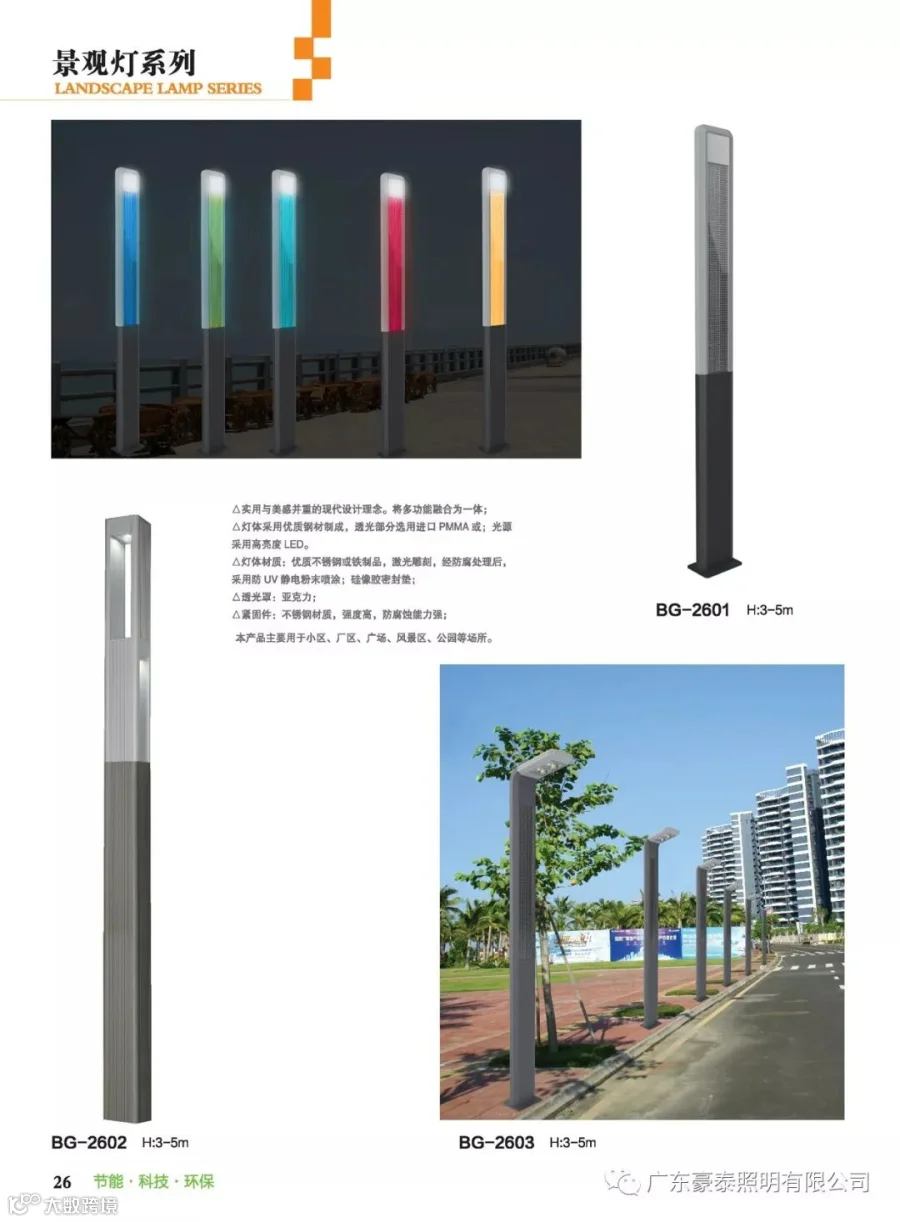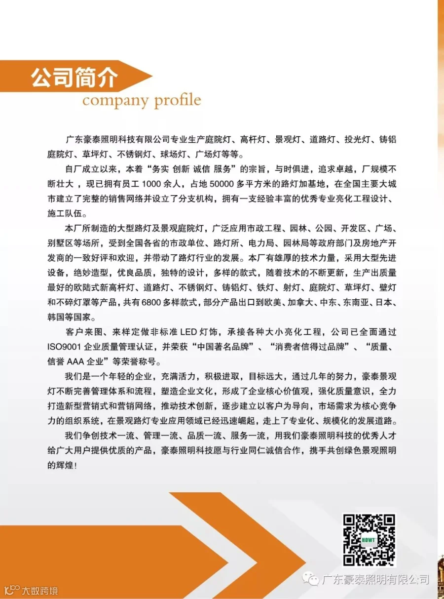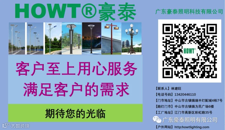 广东豪泰照明科技有限公司是一家专业道路照明设施及各种路灯和户外照明工程配套设施生产、销售于一体的专业厂家。主要产品有:景观灯、庭院灯、太阳能路灯、太阳能景观灯、太阳能草坪灯、太阳能柱头灯、太阳能庭院灯、太阳能壁灯、中华灯、高杆灯、道路灯、户外壁灯、LED节能路灯头等各类非标产品,客户来图定制定做。在设计方面,我们自行开发国际级路灯照明产品。为配合不同环境的造景要求,开发出不同功能的造型灯具,融合路灯的配光性能及不同物体的反射特性,开创新路灯照明技术。