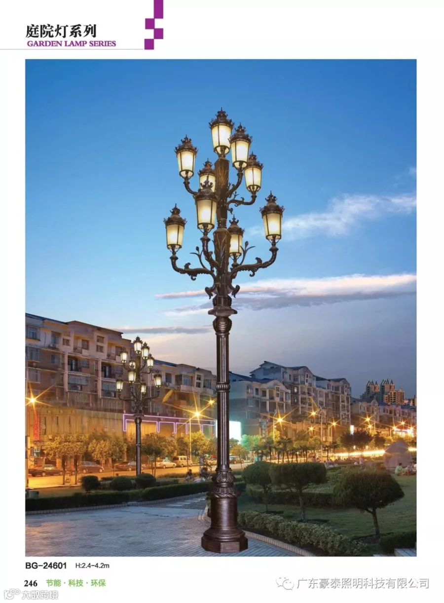 庭院灯是户外照明灯具的一种,通常是指6米以下的户外道路照明灯具,其主要部件由:光源、灯具、灯杆、法兰盘、基础预埋件5部分组成,因为庭院灯其具有多样性、美观性具有美化和装饰环境的特点,所以也被称之为景观庭院灯。主要应用于城市慢车道、窄车道、居民小区、旅游景区,公园、广场等公共场所的室外照明,能够延长人们的户外活动的时间,提高财产的安全。