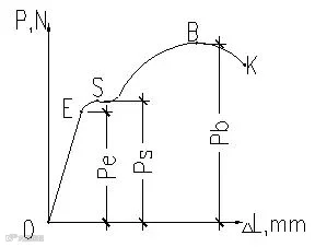 负荷超过S点后,形变量随负荷增加而急剧增加,当过B点,形变部位出现缩颈现象,试样已不能抵抗外力作用,在K点发生断裂。试样拉断前能承受的最大负荷 Pb所对应的应力称为抗拉强度,用σb表示。