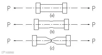 强度是金属材料抵抗塑性变形或断裂的能力。强度可通过拉力试验来测定。将图(a)所示标准样安装在拉力试验机上,对其施加一个平稳而无冲击逐渐递增的轴向拉力,随着拉力的增加试样产生形变如图(B)直到断裂如图(C)。