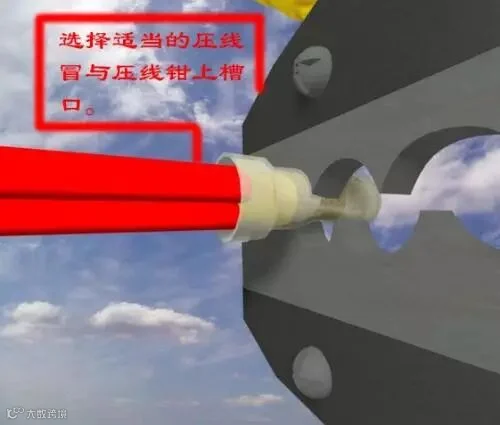 下面是第三种接法,就是压线冒接线法,这种方法是最规范和最实用的,但是它需要专用工具来做,压线冒的压线钳来压线,把压电线用的专用钳子,套在压线冒上,用力压紧就行了。另外还要说一下,压线冒的大小根据所压线经的大小与根数有关我们常用的是T4型的,就是直径毫米的,能压四根四平方毫米的电线。
