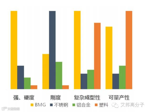 图:液体金属BMG、不锈钢、铝合金、塑料等强度、刚性、成型、量产性对比