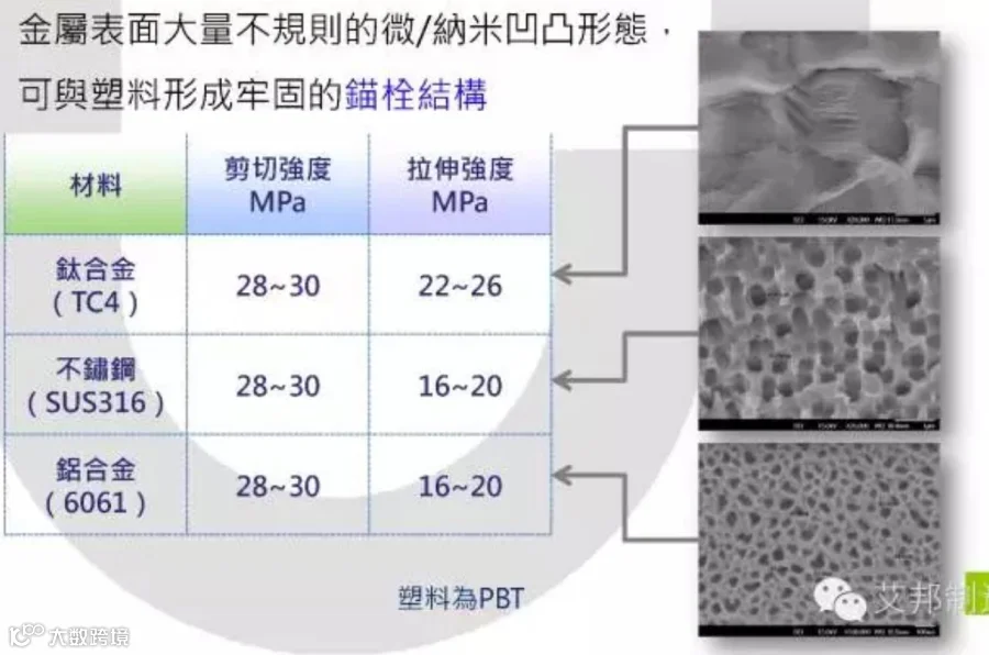 纳米注塑是一种异种金属材质通过注塑连接在一起的技术,先把金属在药水中处理,界面形成微纳米孔洞结构,再通过注塑,把金属和塑胶在模内注塑在一起。纳米注塑的钛铝合金剪切强度与采用不锈钢、铝合金差别不大,但是其拉伸强度提高了20%以上,这种材质是用于超薄手机最佳选择。