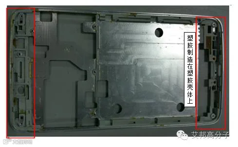 若手机底盖采用非金属材料,则中框是金属的材质,天线制造在“金属包塑胶”结构的塑胶上,见下图: