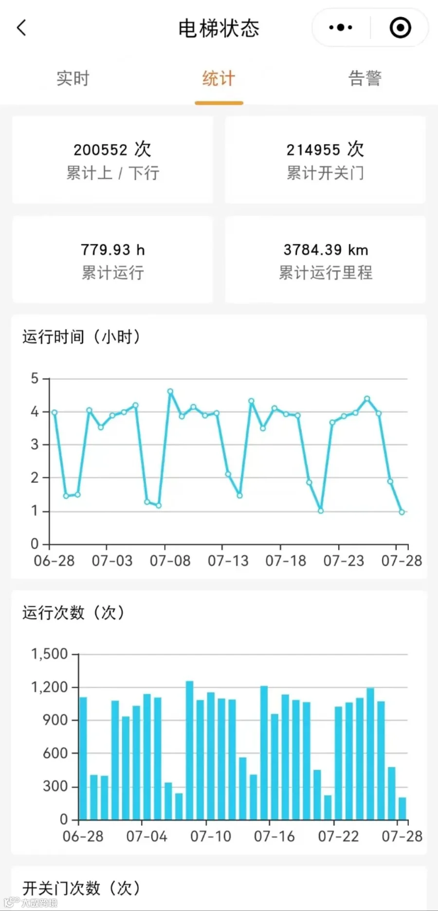 系统可直观展示电梯上下行、开关门次数,智能统计电梯运行时间、运行里程等,为综合分析电梯使用情况提供数据支撑。