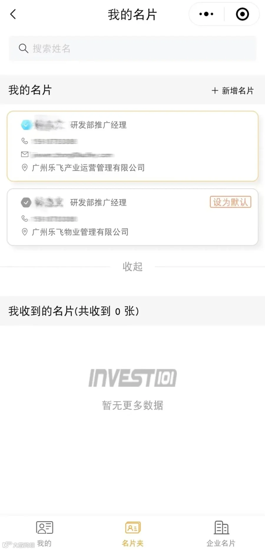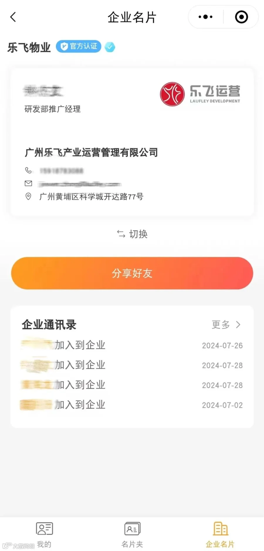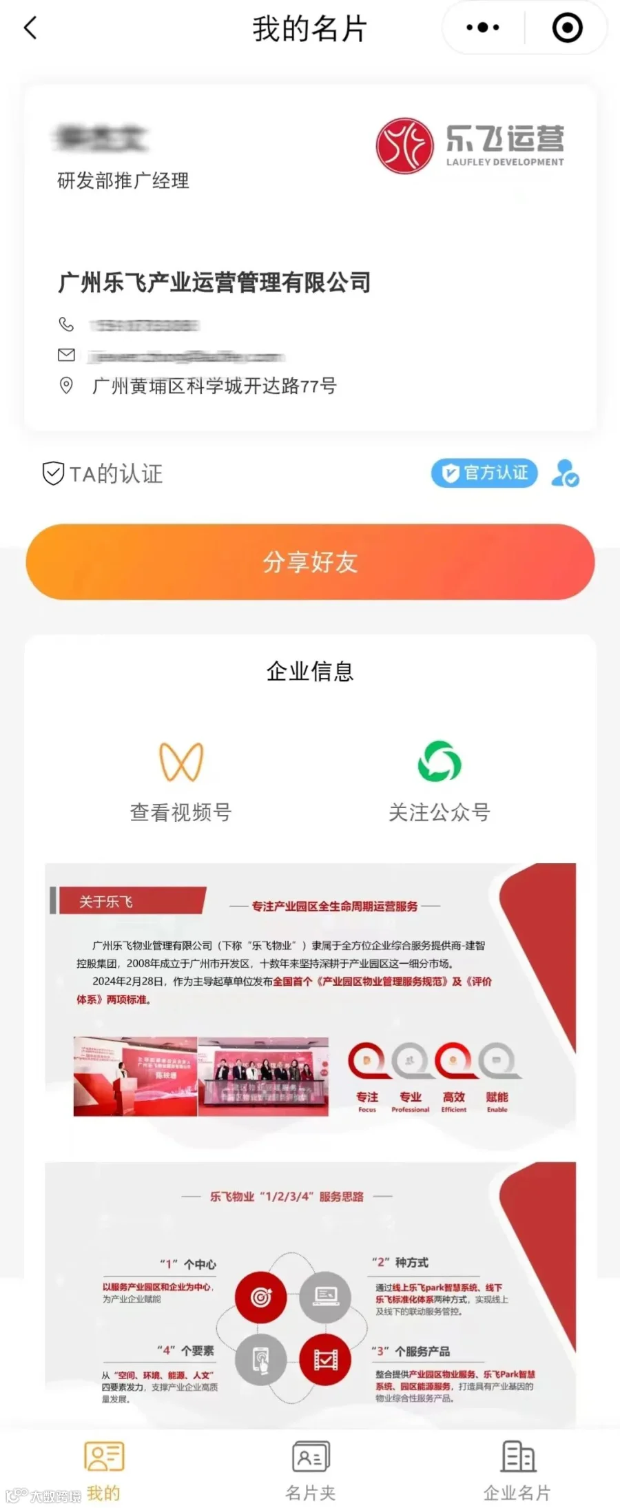 乐飞Park智慧管理系统新开发企业名片功能,免费为个人和企业用户提供电子名片设置与保存,满足个人和企业现代商务交流的需求。