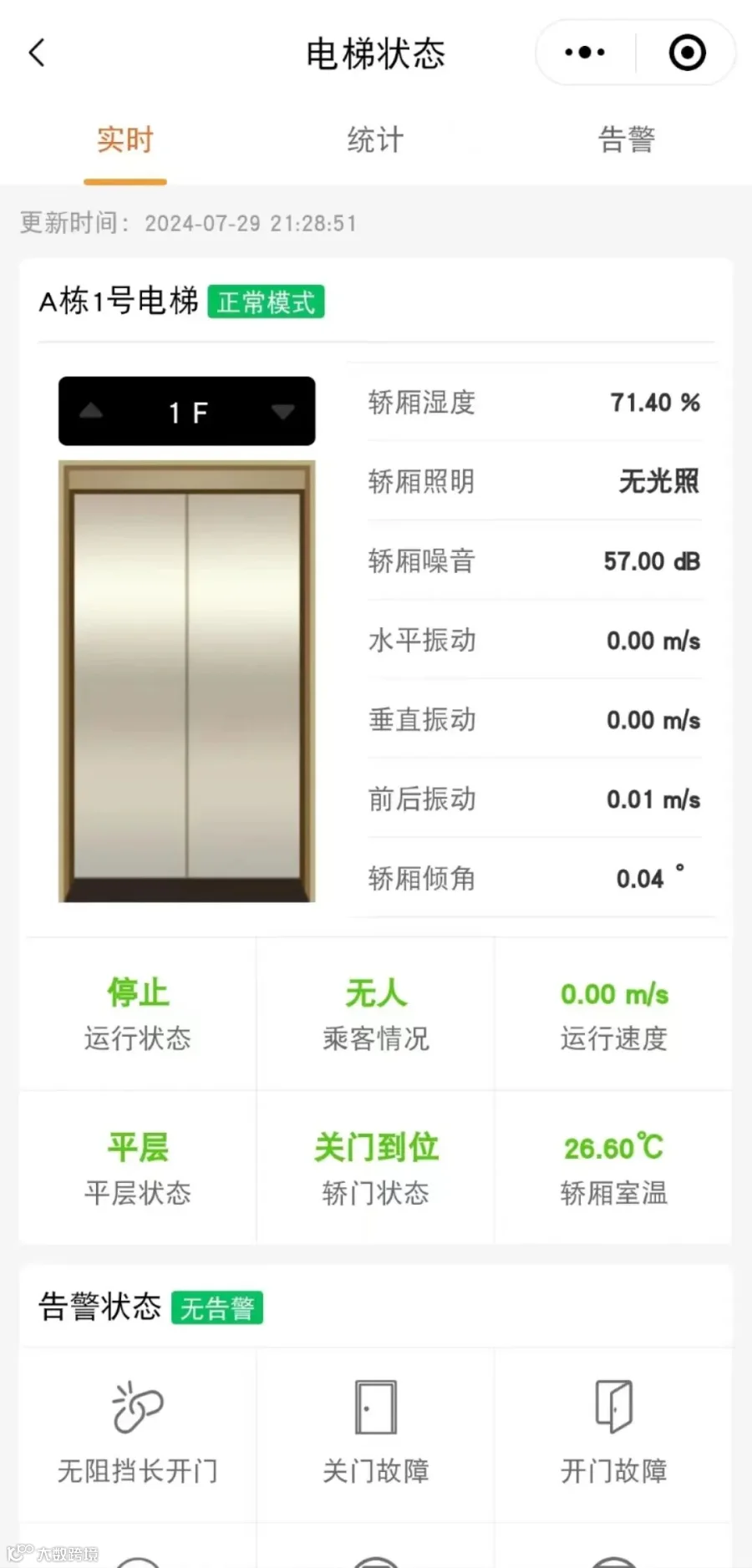 使用4G/5G网络,通过物联网平台标准协议对接电梯物联网设备,在移动端和后台端均可实时展示电梯运行状态、乘客情况、轿厢温湿度等。