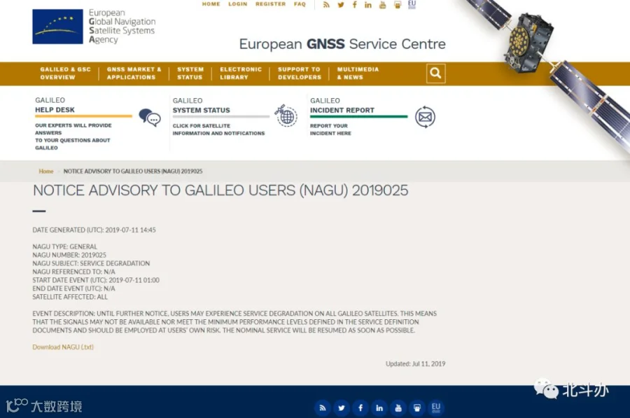系统服务恶化告警,该故障出现在2019年07月11日01:00(北京时间7月11日09:00),啥时候能解决不知道,该故障影响的范围是所有伽利略系统的卫星。