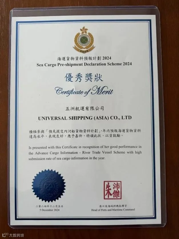 五洲航运作为注册地在香港的支线海运企业,始终积极配合香港政府部门,高标准完成海运货物资料预申报工作,全年预报水平表现卓越,香港海关特颁奖状嘉许鼓励。