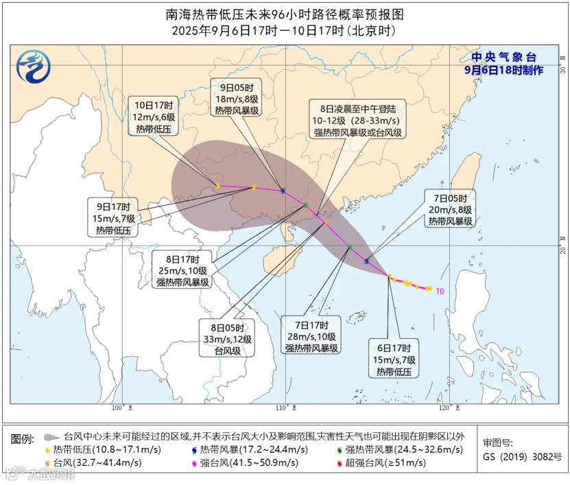 预计,该低压中心将以每小时15公里左右的速度向西北方向移动,强度逐渐加强,将于今天夜间加强为今年第16号台风,之后趋向广东中西部沿海,并将于8日凌晨到中午在广东珠海至湛江一带沿海登陆(强热带风暴级或台风级,28-33米/秒,10-12级),登陆后强度逐渐减弱。
