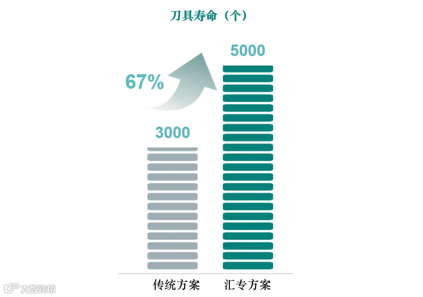客户使用汇专超声高效精密雕铣加工中心ULM-400进行加工误差在0.01mm内的微孔,传统加工方案可持续加工3000个左右,而汇专方案可持续加工5000个左右,刀具寿命提升67%!