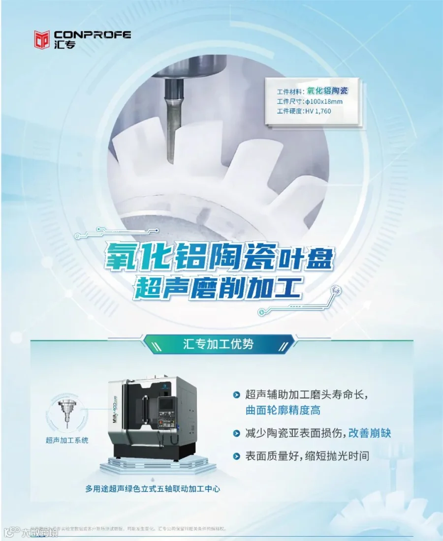 颜董事长在报告中指出,先进陶瓷材料是典型的难加工材料,在加工过程中极易出现工件崩缺、表面裂纹以及刀具磨损等问题。为解决陶瓷这类硬脆性材料加工的难点和痛点,汇专提出了超声加工整体解决方案,采用集成自主研发超声加工系统的汇专超声数控机床,能够大幅降低切削力,减少工件亚表面损伤和微裂纹,有效避免硬脆性材料断裂及崩缺,显著提高加工效率、延长刀具寿命,实现陶瓷等硬脆材料的高效高质量加工。