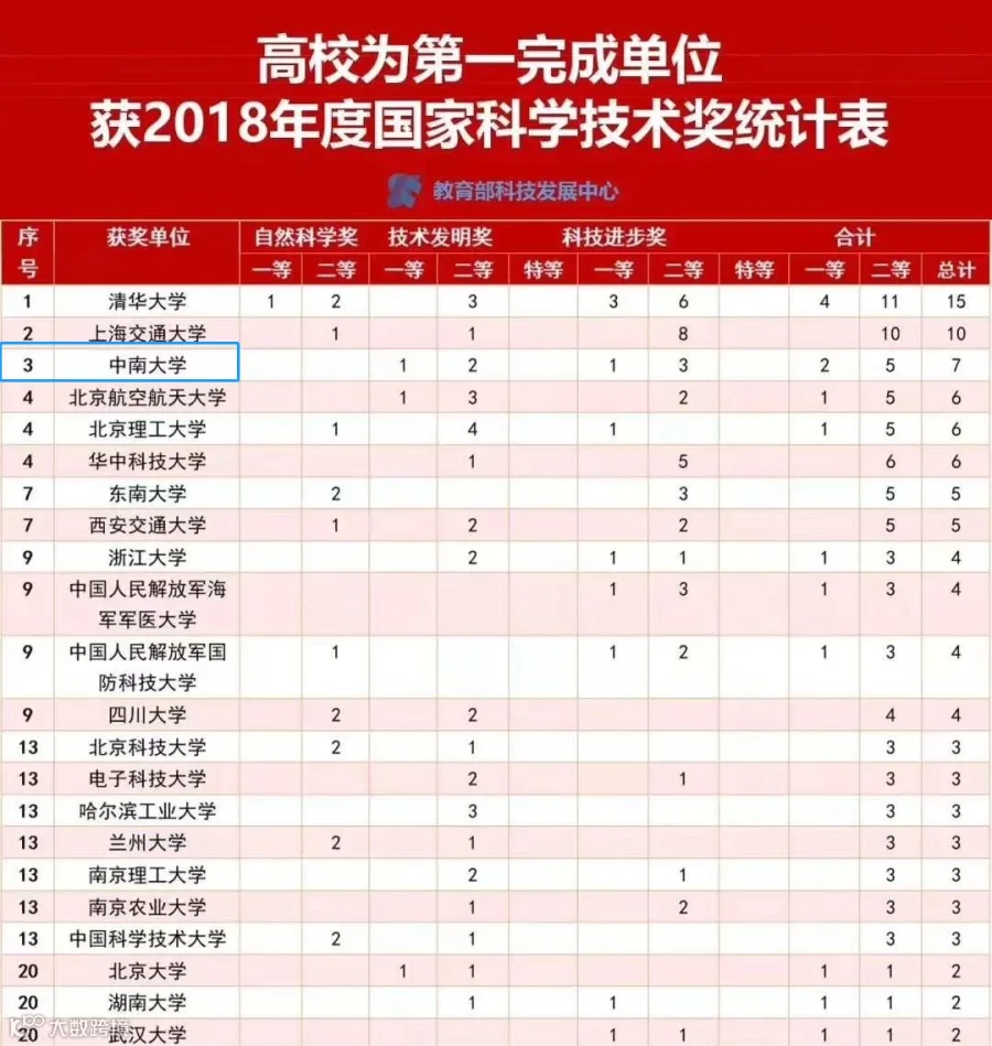 依据最新出炉的“高校为第一完成单位获2018年度国家科学技术奖”统计表,中南大学获奖数量名列国内高校前三名,足以证明了中南大学在科研方面的不俗实力。