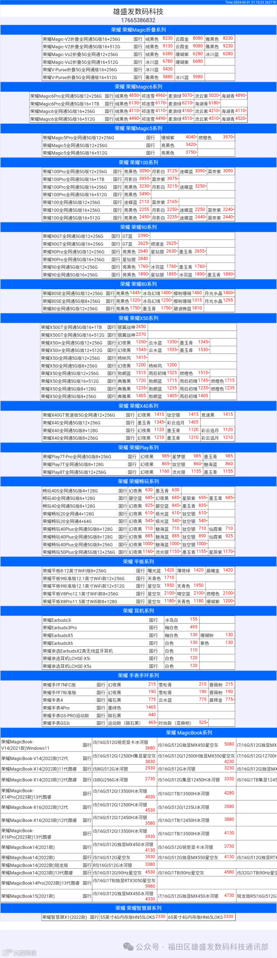 新机报价【2024年3月1日】华为   荣耀 报价 芯烨微 电子科技