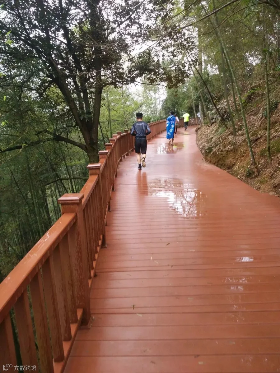 有一段上坡路,坡度达到六七时,完全迈不开腿跑,只能艰难的弓着身子攀走,很虐心。当然也有下坡路,跑起来完全刹不住车,那叫一个刺激。在木栈道上,由于下雨路滑,所以大家都小心翼翼,还互相避让,让人觉得这真是一个文明的比赛。